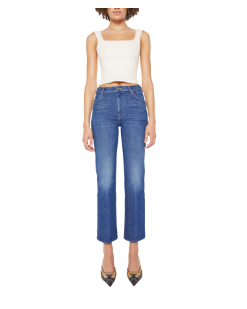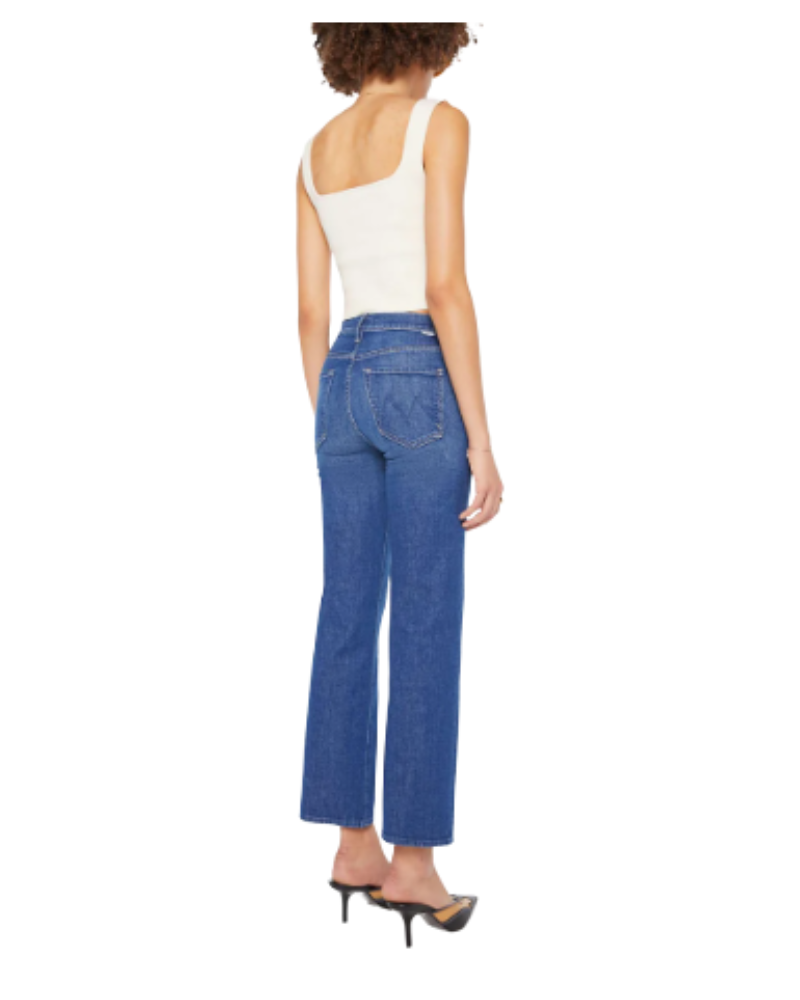 Off the grid. A high-rise straight leg jean with a zip fly, 28.25-inch inseam and a clean hem. Made from denim with a touch of stretch, Do Not Disturb is a mid-blue with whiskering and fading at the knee.