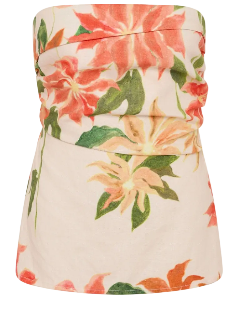 A strapless tunic-style top, designed from a signature 100% European Flax® linen in a custom floral print, nodding to the colours and vibrancy of Mexico by bringing together creamy neutrals with warm apricots and soft greens. Featuring an asymmetric tuck detail along the front bodice, it is gathered through the sides for a more flattering fit and offers a shirred back panel for additional stretch. Finished with a slanted curved hem that cuts below the hips, style over the matching Martina Maxi Skirt for effortless summer set dressing.