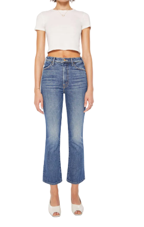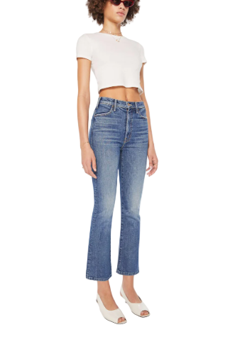 MOTHER makes the rules. This bestselling high-rise flare has a zip fly, ankle-length inseam and a clean hem. Crafted from semi-rigid denim, Bending The Rules is a mid-blue with whiskering and fading at the knees.