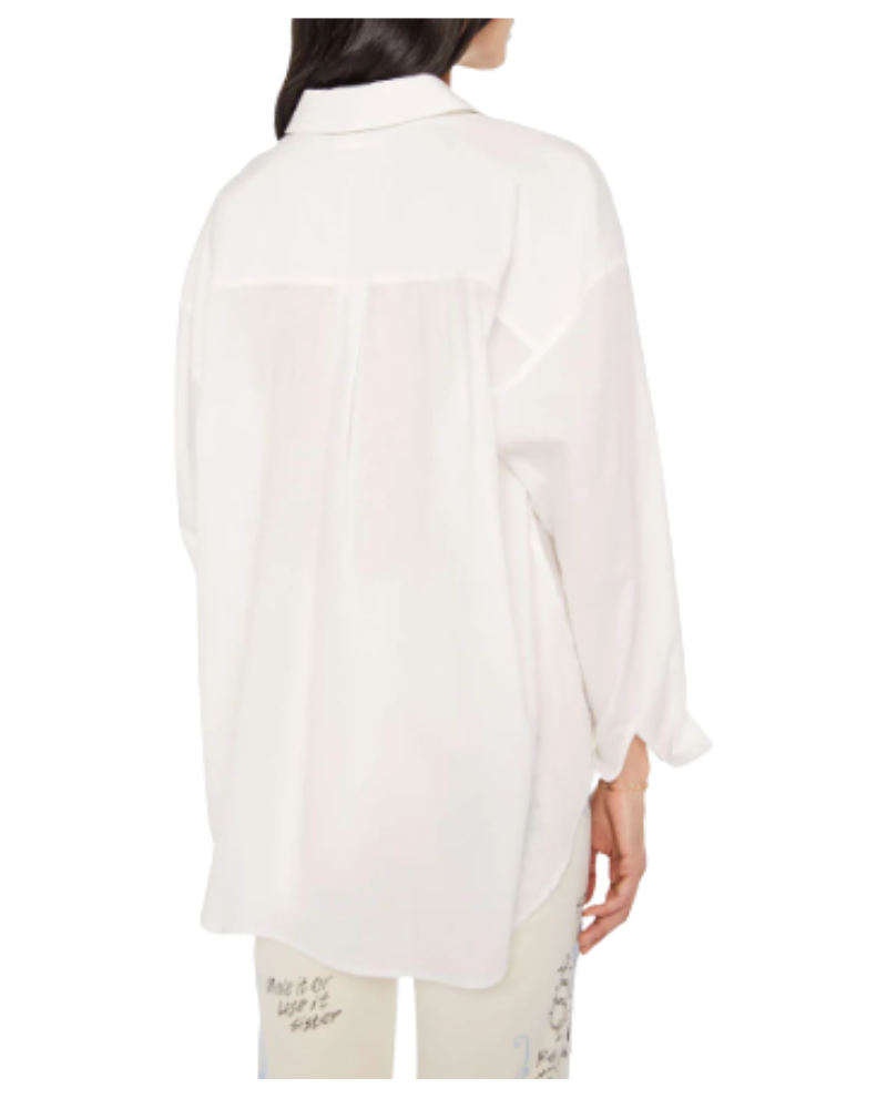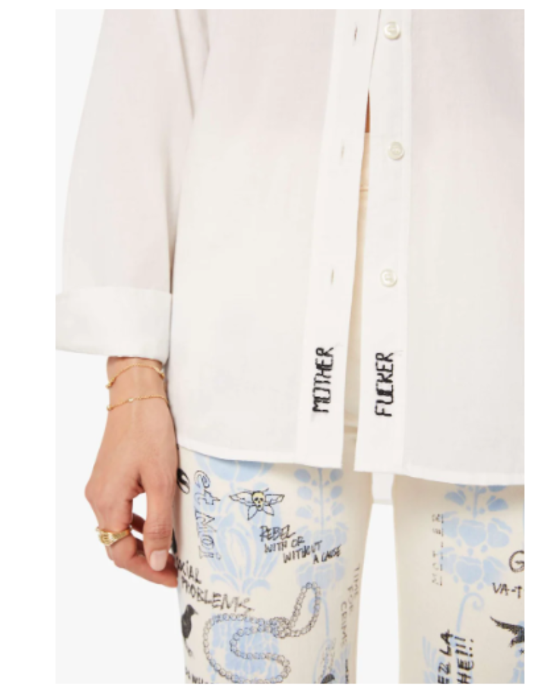 Read between the lines. A classic button-up with drop shoulders, an oversized patch pocket at the chest and a curved hem. Made from 100% cotton in white, "MOTHER FUCKER" is embroidered in black on the button band.