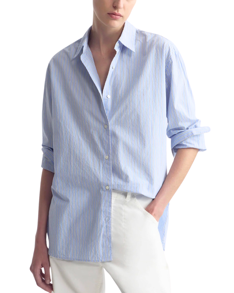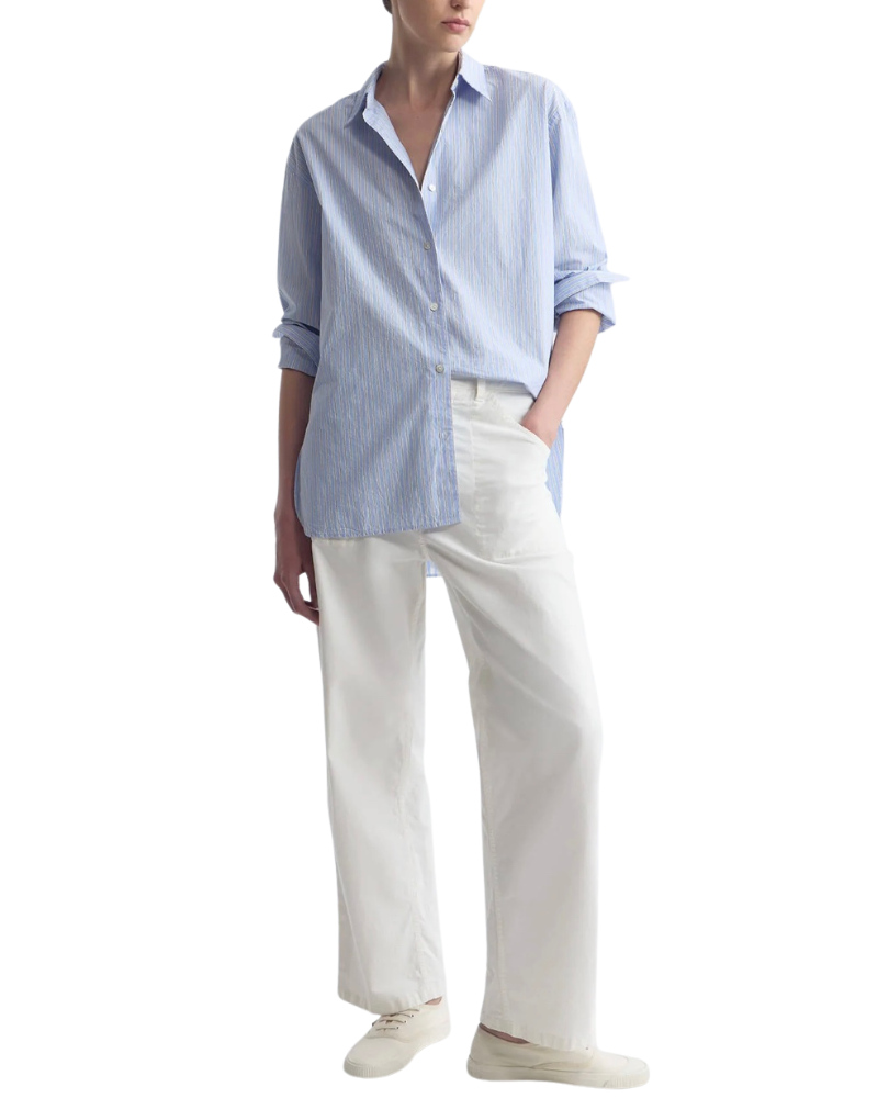 Oversized button down shirt in cotton. Center front placket. Cuff placket. Exaggerated shirttail hem.