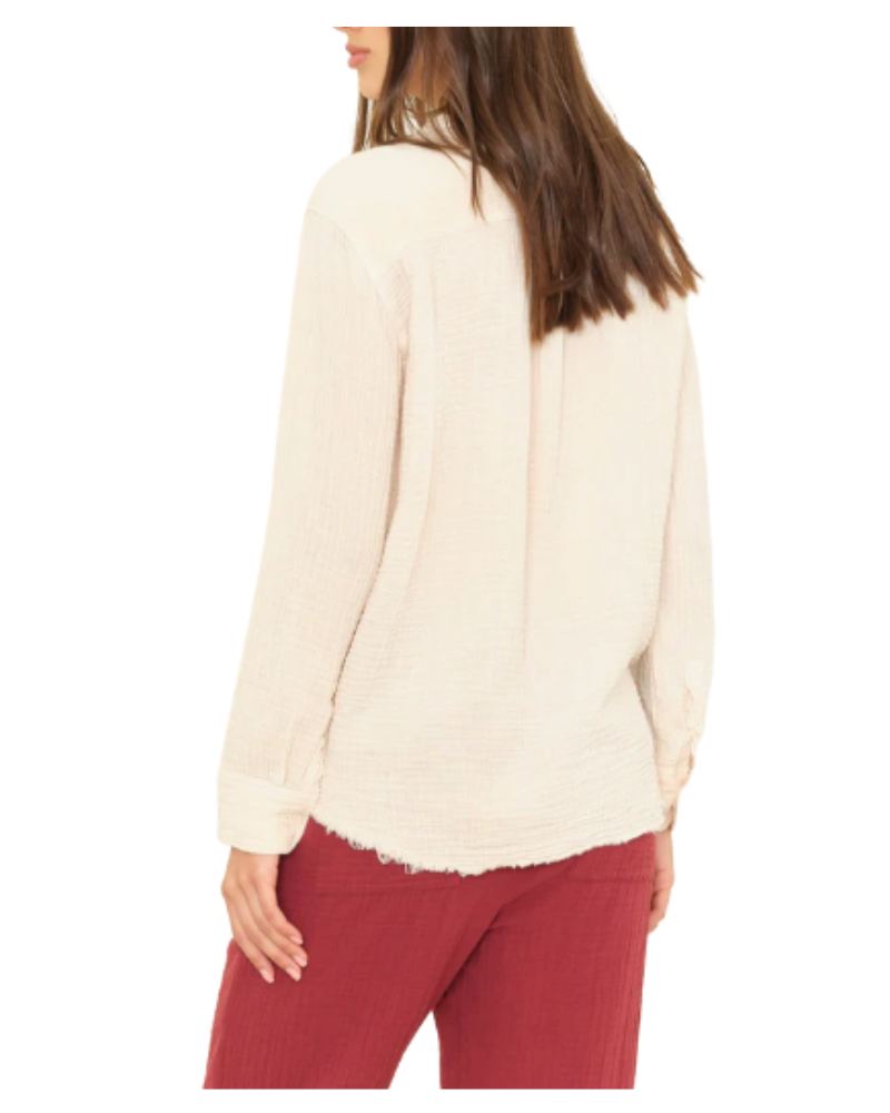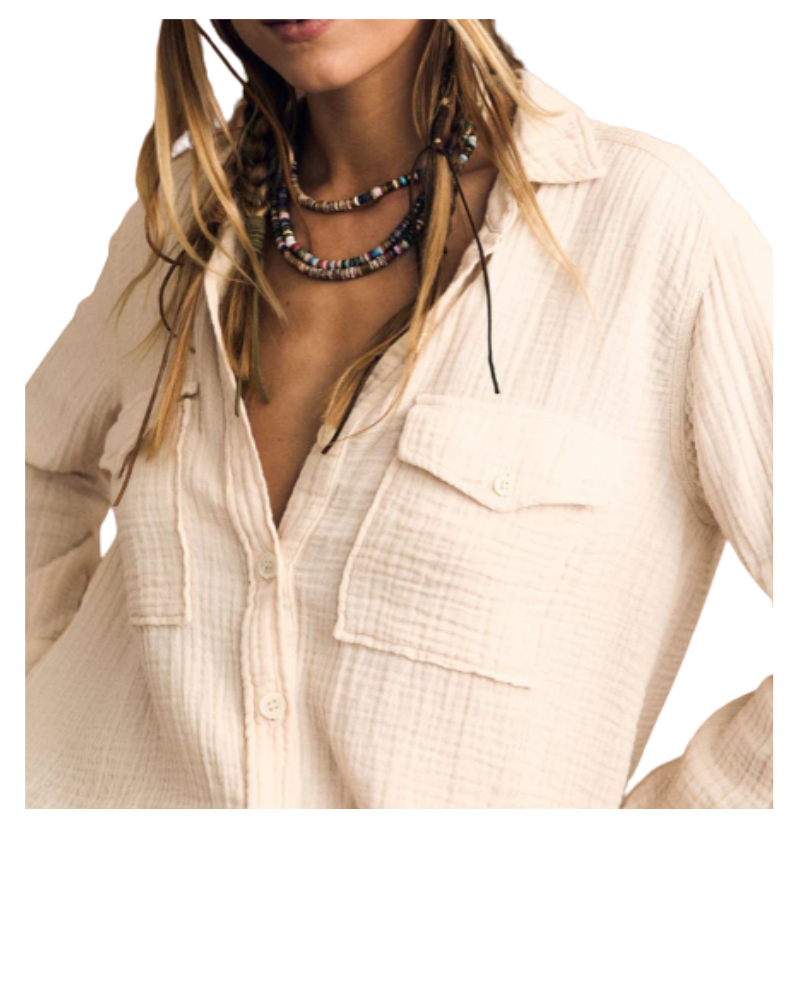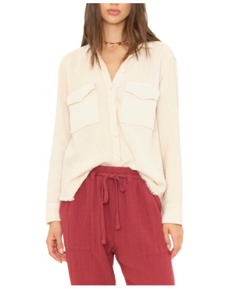 Bare Necessities. Chariot is new this season in our washed double faced cotton gauze for a soft, gently crinkled feel. This relaxed button-front shirt features two front patch pockets and a raw edge hem.