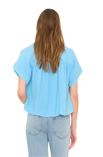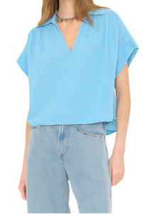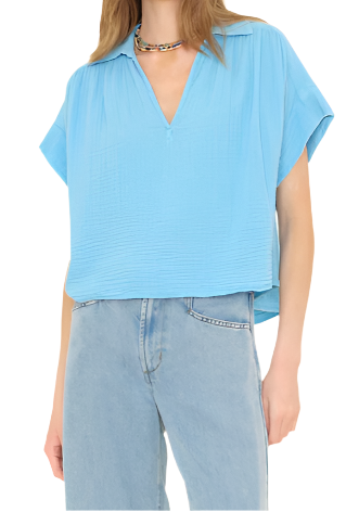 Play it cool. Reggie is new this season in our washed double faced cotton gauze for a soft, gently crinkled feel. This easy pullover top has a slight crop and features a split neck, raw edge sleeves, and shirred front and back yokes.