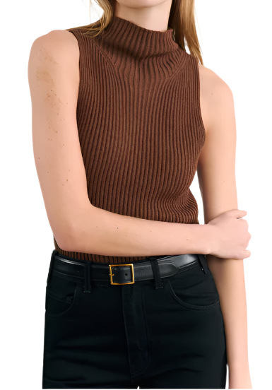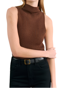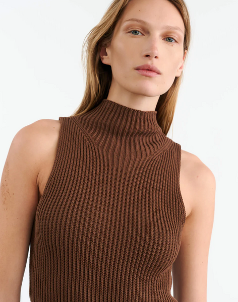 Medium weight ribbed sleeveless turtleneck sweater in Italian cotton. Fully fashioned at arm hole and shoulder.