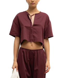 Crafted in our bed sheet feel Yoko Cotton, The Yoko Short Sleeve Tie Top features a deep V neckline, cropped length and a delicate tie closure at front. Complete the set with any Yoko bottom.